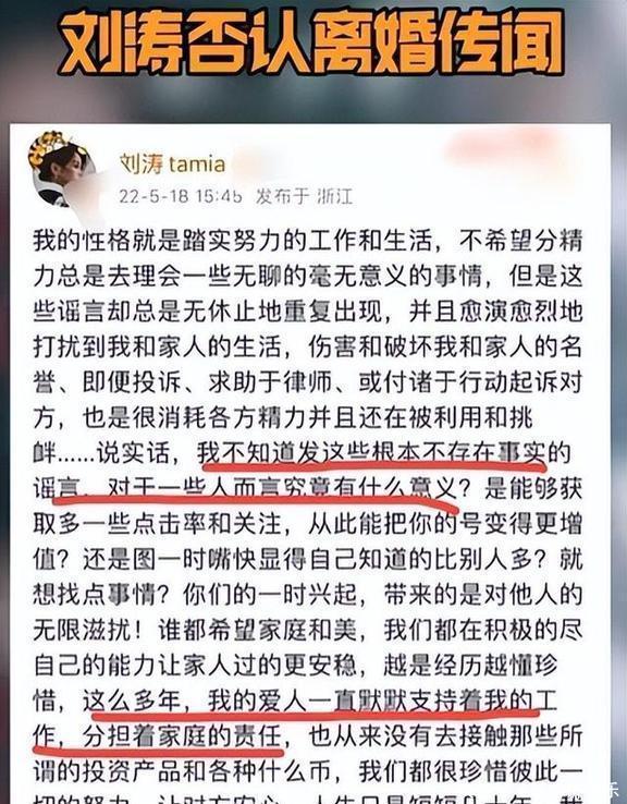 2022年,有博主瞎说王珂因为炒币亏了钱,导致夫妻俩闹离婚,刘涛的工作室立马出来澄清了。而且,刘涛还找北京星权律师事务所打官司,结果逼得对方公开道歉。